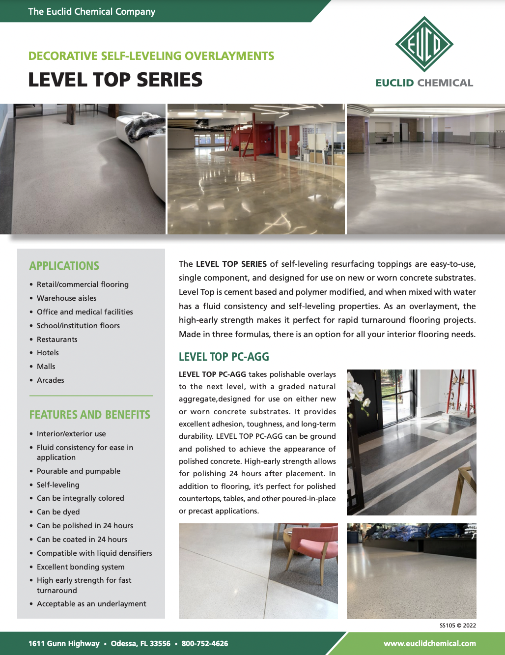 The Level Top series of self leveling resurfacing toppings are easy-to-use, single component, and designed for use on new or worn concrete substrates. Level Top is cement based and polymer modified, and when mixed with water has a fluid consistency and self-leveling properties. As an overlayment, the high-early strength makes it perfect for rapid turnaround flooring projects. Made in three formulas, there is an option for all your interior flooring needs.